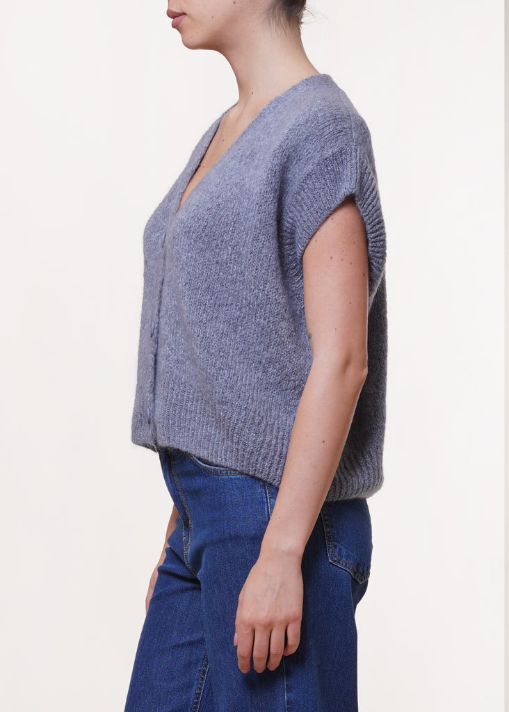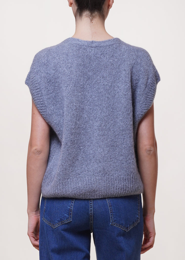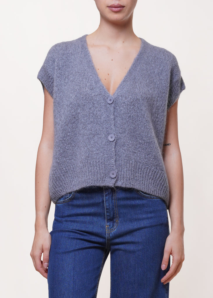 Composizione: 40% mohair, 28% acrilico, 22% polaimmide, 10% lana - Modello smanicato caratterizzato da una linea morbida e dettagli a costine su orlo e giromanica. Il profondo scollo a v e la chiusura frontale con tre bottoni lo rendono ideale per sovrapposizioni sofisticate.