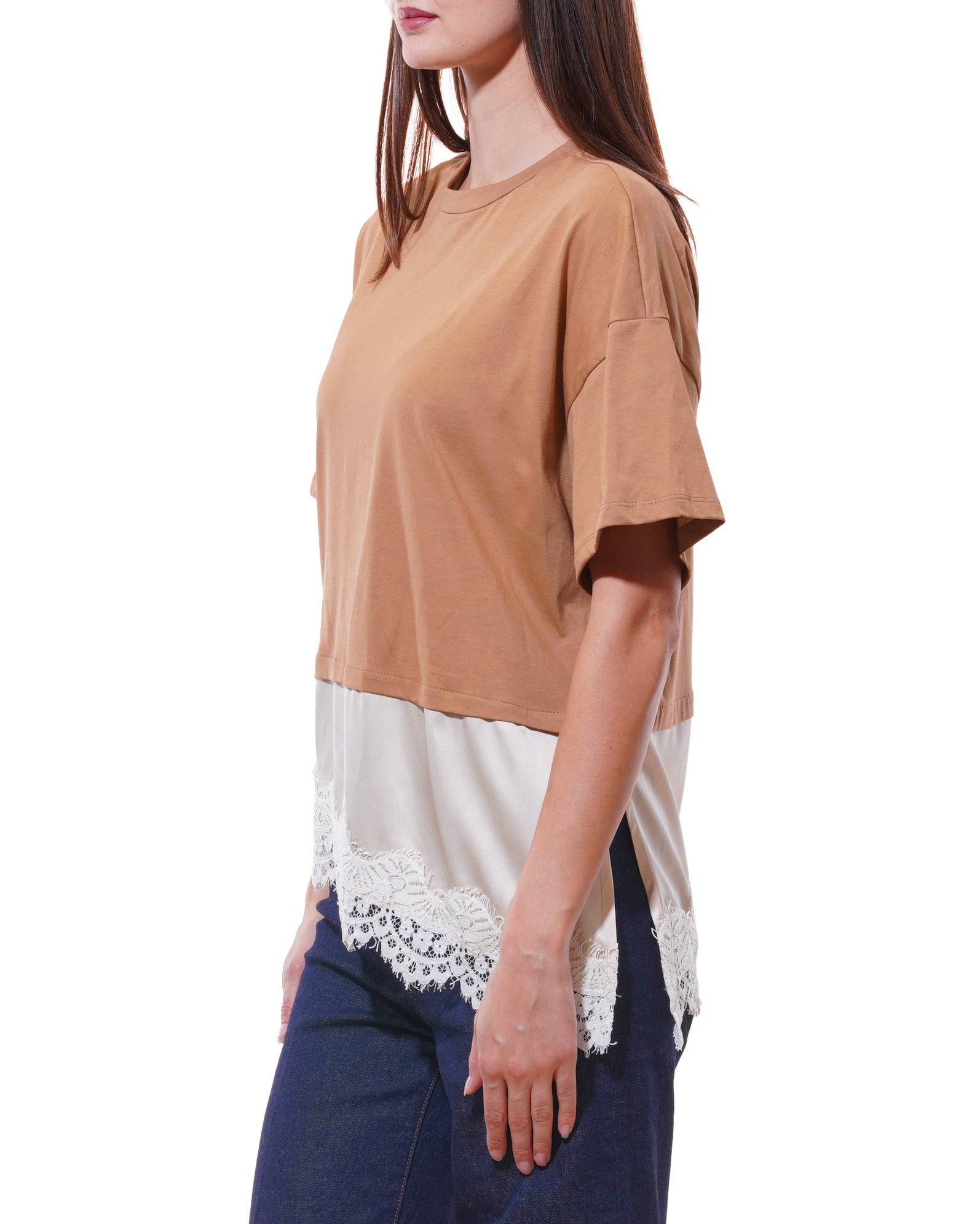 Dixie - T-shirt con dettaglio in pizzo e satin - CAMMELLO